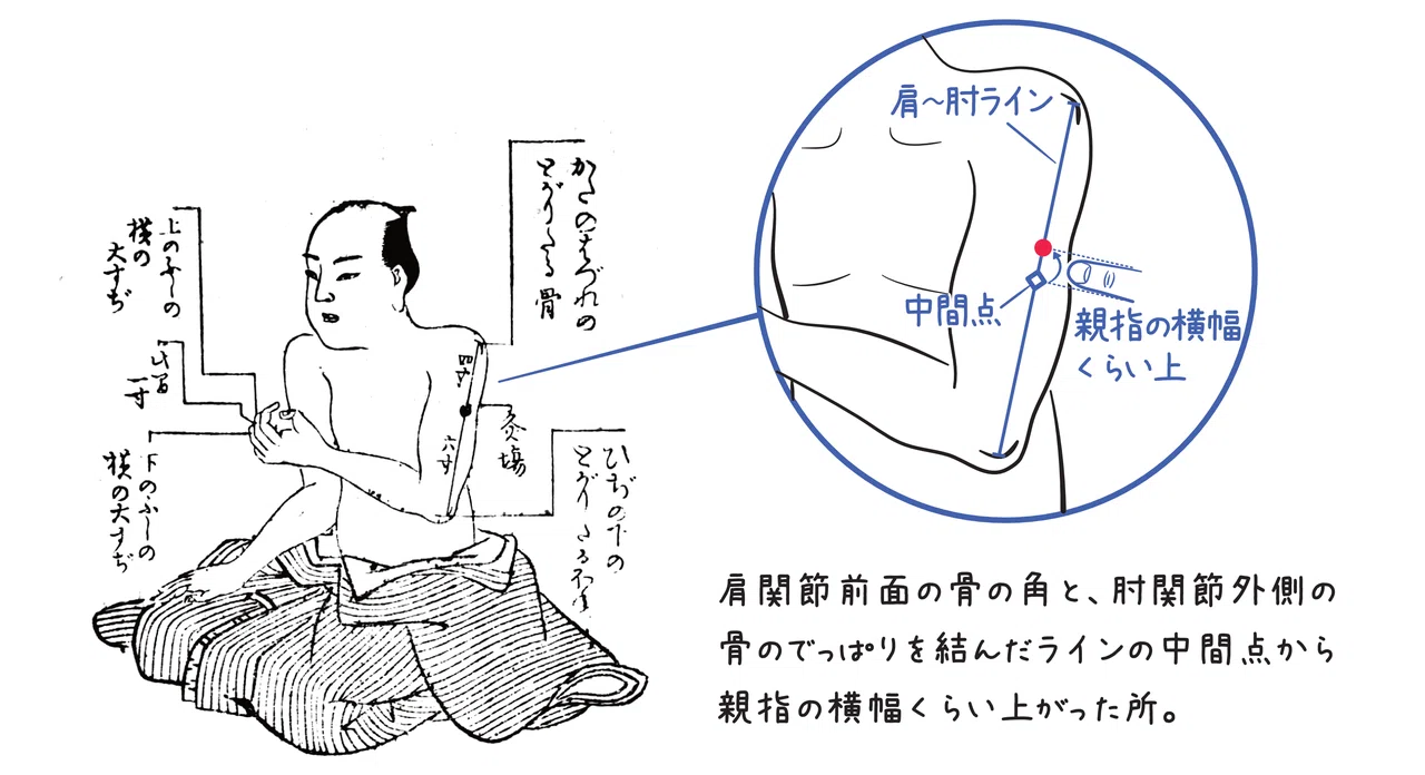 〔左の如く肩のはつれのとがりたるほねと臂(ひぢ)の下のとかりたるほねとますぐににらみ其間を一尺と定めこよりをわたすべし。さて上のかた四寸下のかた六寸との間のくぼくあなのやうな所、即灸穴なり。ふとりてわからぬ人はその所をおせばふかく穴のやうにほねのあたらぬ所としるべし。ちからこぶのうらにあたるすこし上にてくぼき所なればしろうとにもしらるるなり。左右ともに寸法おなし。但し一尺は圖の如く手の中指をかがめ上のふしの横の大筋と下のふしの横の大筋と堺にして中を一寸ととり十をあはせて一尺とするなり。小児にても老人にても長くてもみしかくてもそれにて一尺なり。すゆる時手のひらをむないたに当(あて)べし。〕