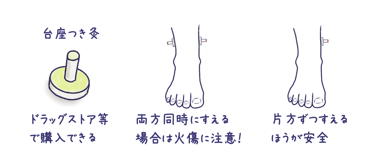 家庭用の台座つき灸で行います。両方同時に行ってもよいですが、お灸の先端の角度が下を向いていると、熱気が上昇して火傷になりやすいので注意が必要です。