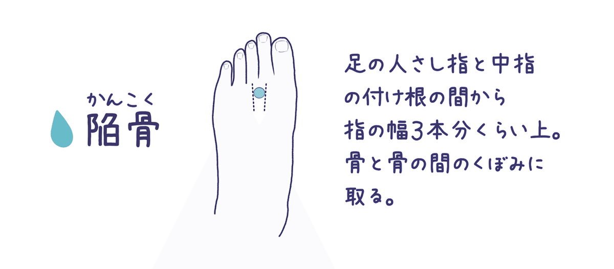 場所:足の人さし指と中指の付け根の間から、指の幅3本分くらい上。骨と骨の間のくぼみに取る。